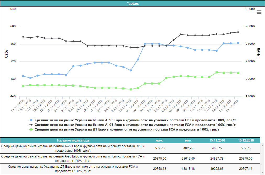 15 декабря 2016 г. на рынке нефтепродуктов в Украине отмечалась стабильность цен на бензины А-92 евро, А-95 евро и дизельное топливо в мелком опте.