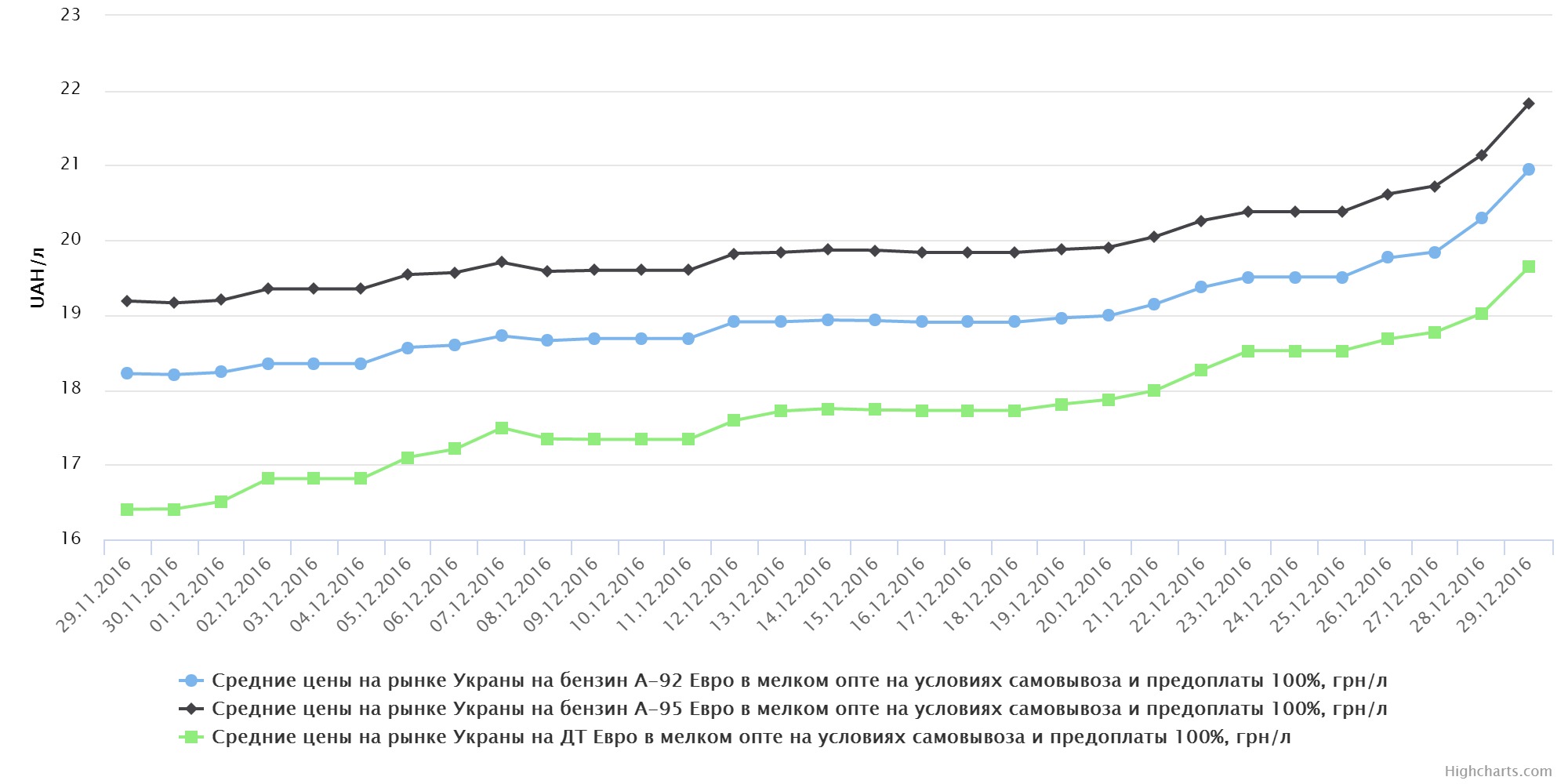 29 декабря 2016 г. на рынке нефтепродуктов в Украине отмечался рост цен на бензины А-92 евро, А-95 евро и дизельное топливо в мелком опте.