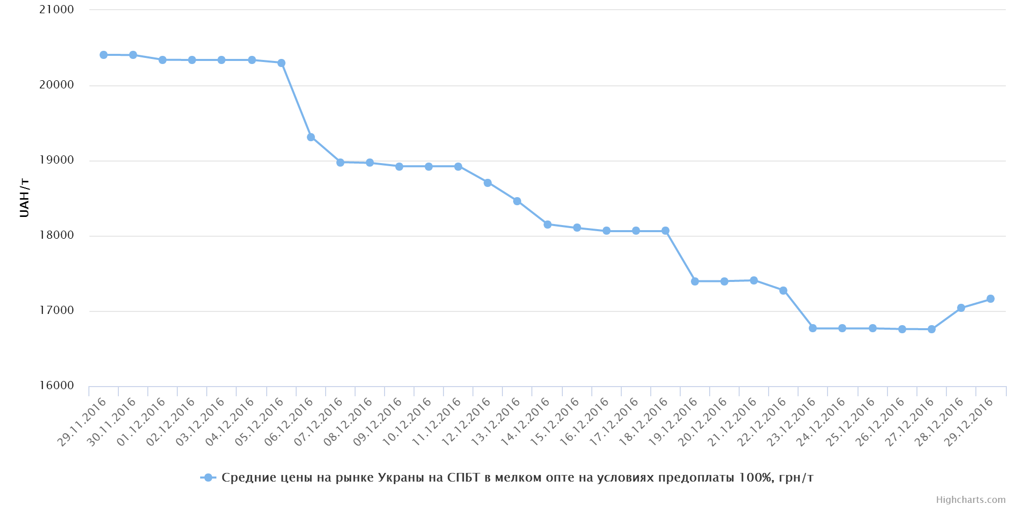 По данным НТЦ «Психея», средняя по Украине мелкооптовая цена СПБТ c 22 декабря по 29 декабря 2016 г. уменьшилась на 0.7%, или 116.3 грн/т, и находится на уровне 17155.82 грн/т. За последние 30 дней цена СПБТ в мелком опте стала меньше на 15.9%, или 3250.1 грн/т.