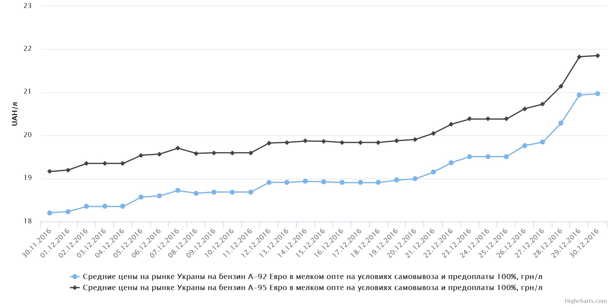 По результатам мониторинга рынка нефтепродуктов в Украине за период c 23.12.2016 по 30.12.2016 отмечалось увеличение мелкооптовых цен на бензины А-92, А-95 и дизельное топливо.