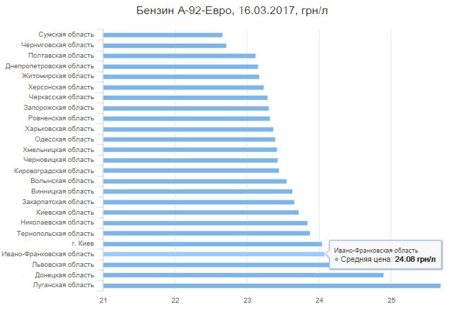 Средняя розничная цена бензина А-92 евро в Ивано-Франковской области за день снизилась на 10 коп/л, что является самым значительным показателем по Украине. Сегодня цена этого вида топлива в регионе составляет – 24,08 грн/л. Максимальная цена этого вида топлива, которая была зафиксирована 26 февраля в регионе – 24,18 грн/л. Тенденция стабильных индикативных цен бензина А-92 евро на заправках Ивано-Франковской области сохранялась практически все 30 дней, однако 16 марта произошло значительное снижение.