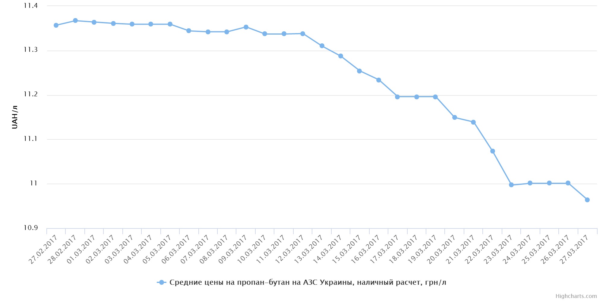 Сжиженный нефтяной газ СПБТ, используемый в качестве моторного топлива, за 27 марта 2017 г. подешевел на 0.34% (4 коп/л) до 10.96 грн/л. Доля цены на сжиженный нефтяной газ по отношению к высокооктановому бензину составляет 44.4%.