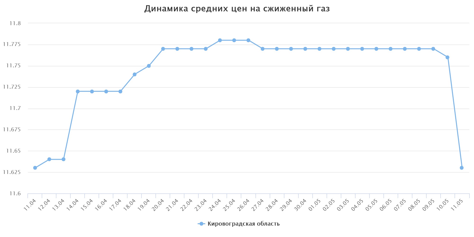 11 мая 2017 года в Кировоградской области наблюдалась стабильность средних розничных цен на светлые нефтепродукты и снижение цены сжиженного газа, используемого в качестве моторного топлива.