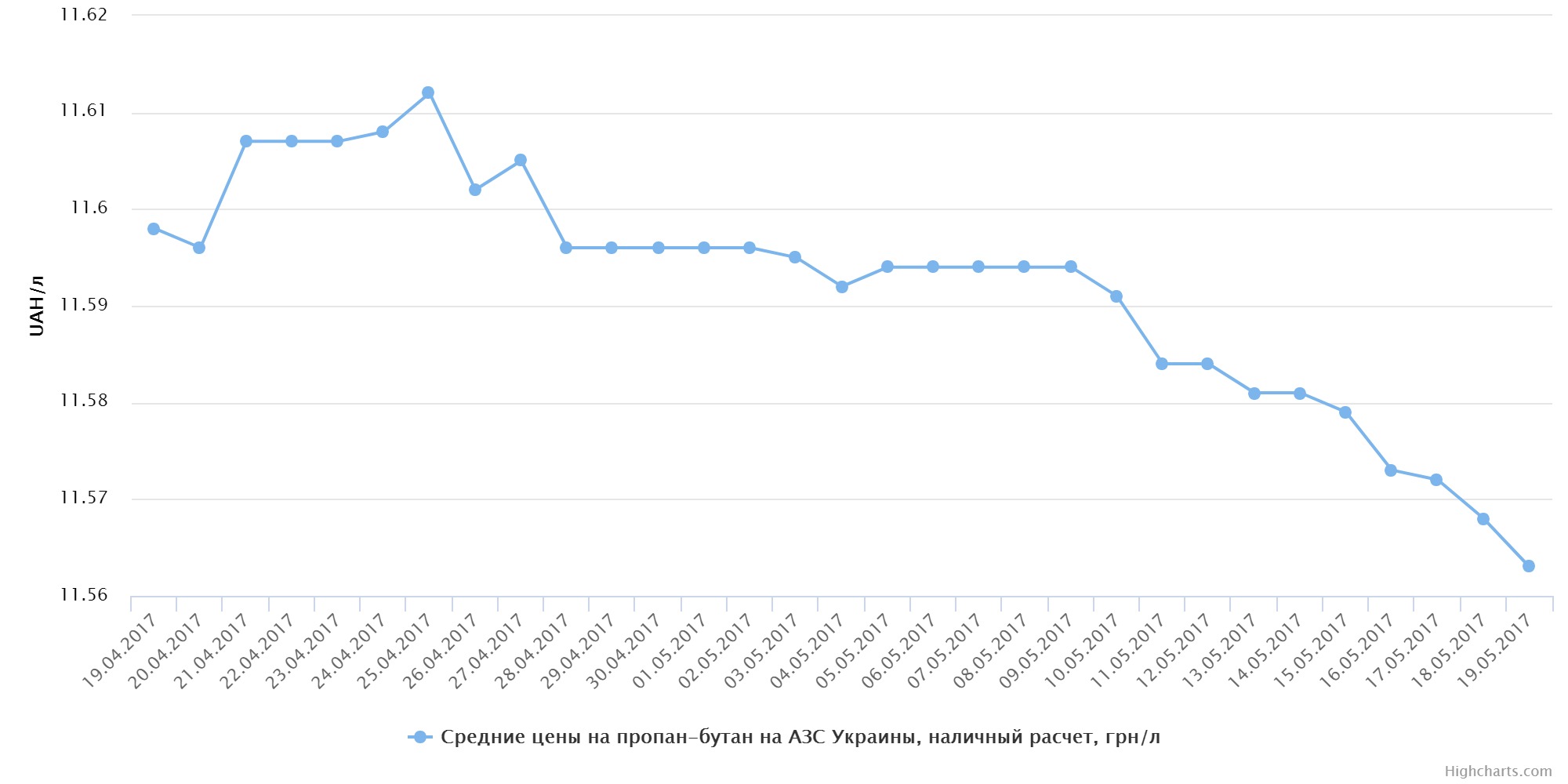 В мелком опте с 12 мая по 19 мая 2017 г стоимость партий бензина А-92 снизилась на 0.40% (8 коп/л) до 21.06 грн/л, бензин А-95 подешевел на 0.44% (10 коп/л) до 22.08 грн/л. В то же время мелкооптовые партии дизельного топлива за неделю подешевели на 1.1% (20 коп/л) до 18.63 грн/л.