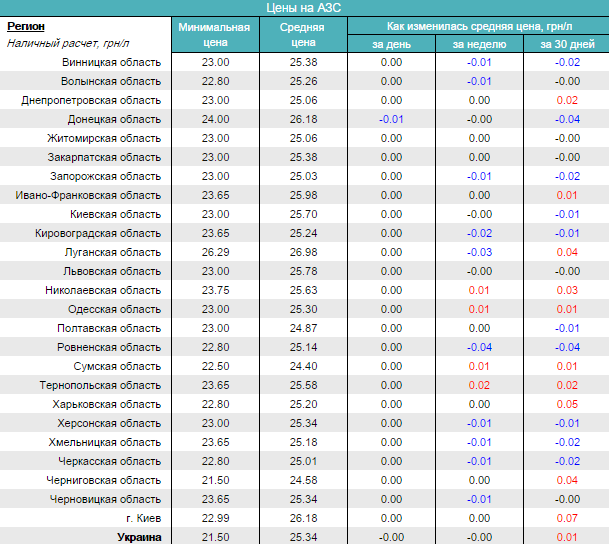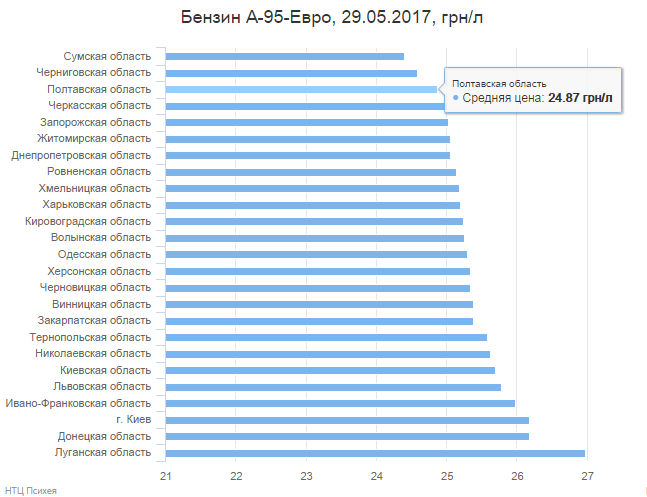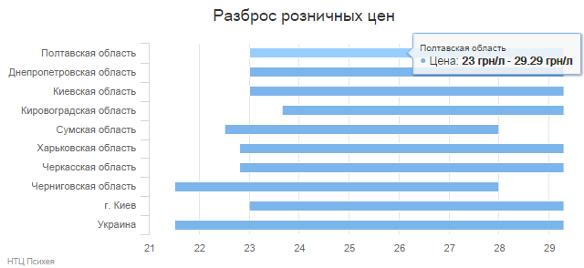 По данным информационно-аналитической системы online-мониторинга и анализа рынков PsycheaFUEL 2.2, более низкие цены были зафиксированы только в Черниговской (24.58 грн/л), и Сумской (24,40 грн/л) областях.