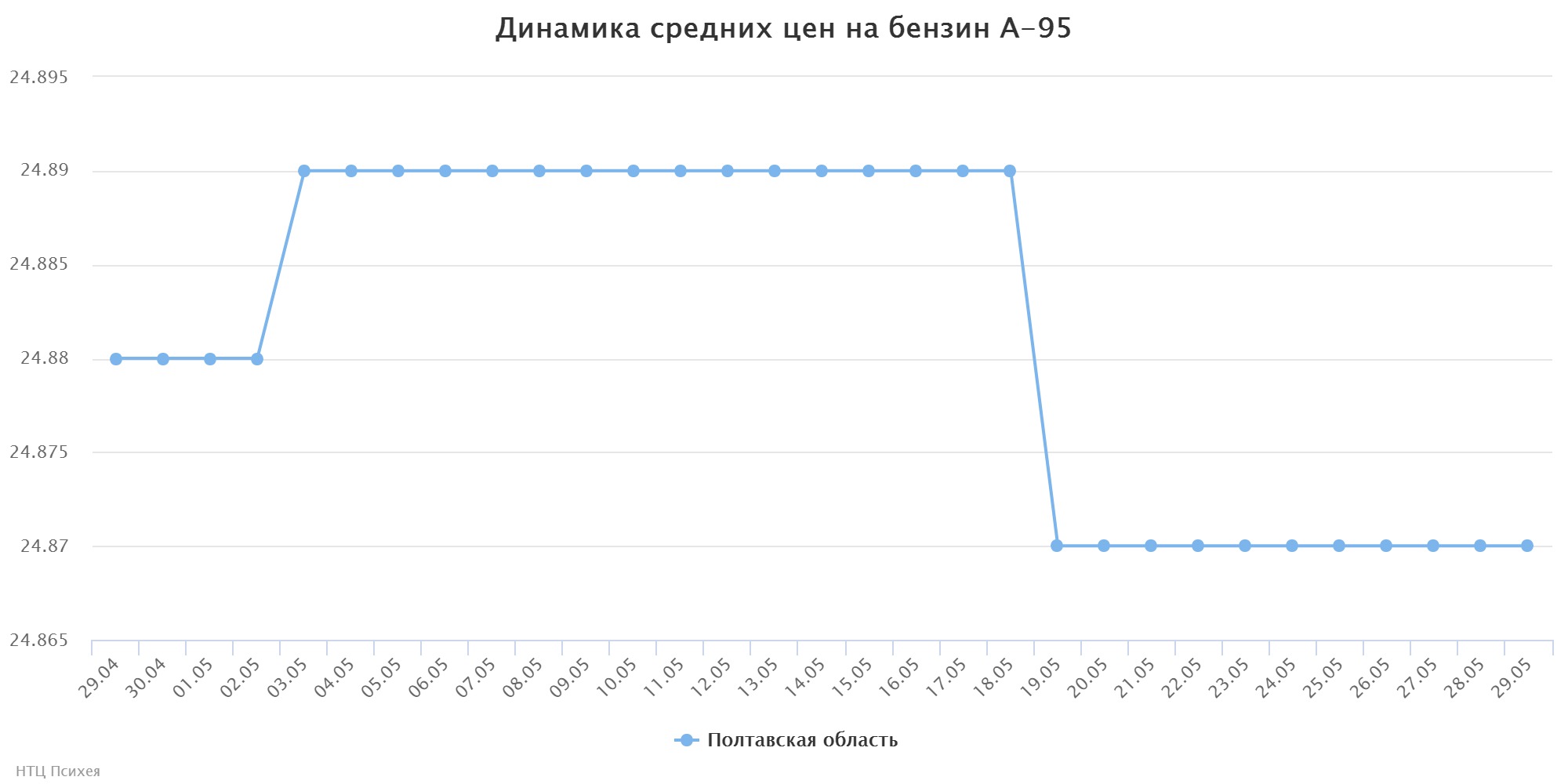 Средняя розничная цена бензина А-95 евро в регионе за последние 30 дней снизилась на 1 коп/л и сегодня составляет – 24,87 грн/л. Самое большое изменение цены этого вида топлива произошло 19 мая, когда этот вид топлива подешевел на 2 коп.