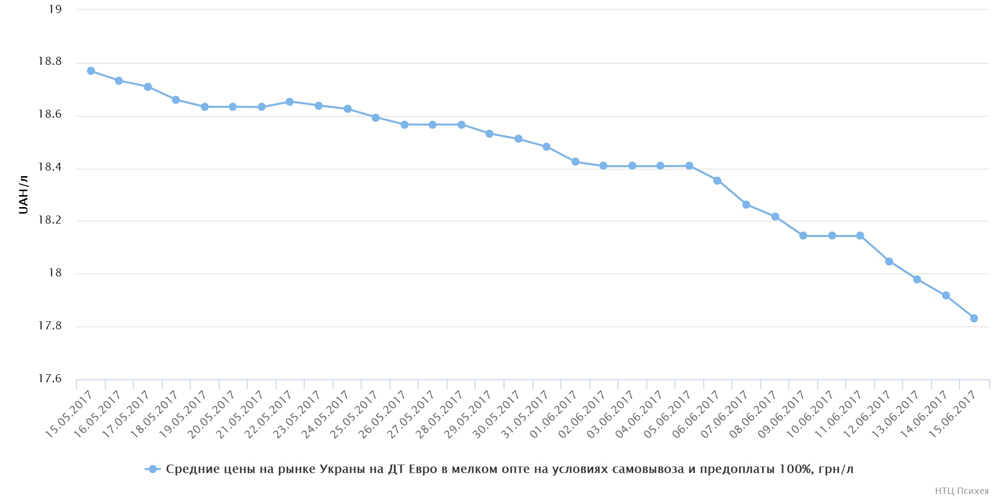 По результатам мониторинга рынка нефтепродуктов, в Украине 15 июня 2017 г в рознице подешевел сжиженный газ, а в мелком опте снизилась цена светлых нефтепродуктов.