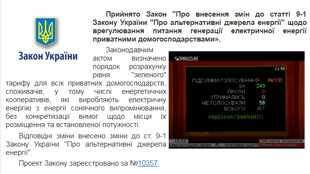 Народні депутати України ухвалили проект закону №10357 про внесення змін до статті 9-1 Закону України «Про альтернативні джерела енергії» щодо врегулювання питання генерації електричної енергії приватними домогосподарствами.