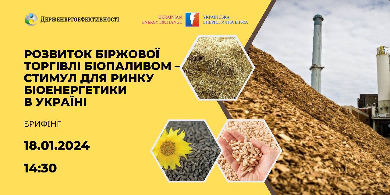 18 січня 2024 року о 14:30 в ІА «Укрінформ» відбудеться брифінг з нагоди старту співпраці Держенергоефективності та Української енергетичної біржі над розвитком енергетичних ринків України, зокрема, над створенням прозорого та конкурентного ринку біопалива.