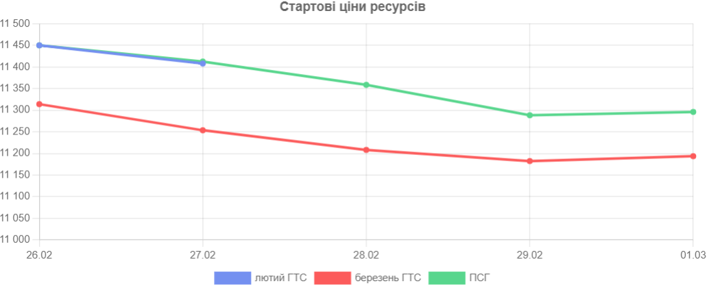 Протягом минулого тижня ціни природного газу в Україні зазнавали знижувались на фоні коливань попиту та пропозиції. Тривала торгівля ресурсом лютого, березня 2024 року. Загалом позиції на купівлю та продаж природного газу формували 3 компанії: Оператор ГТС України, Укрнафта, ГПК Нафтогаз Трейдинг. Стартові ціни ресурсів зменшувались протягом тижня. У підсумку, станом на п’ятницю середня стартова ціна ресурсу в ПСГ була нижчою за показник понеділка на 1,34%. Загалом продано 50,9 млн куб. м природного газу.
