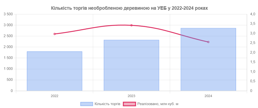 За два квартали 2024 року на УЕБ вже відбулось 2 870 торгів деревиною, продано 2,55 млн м³ сировини на 5,81 млрд грн (з ПДВ).